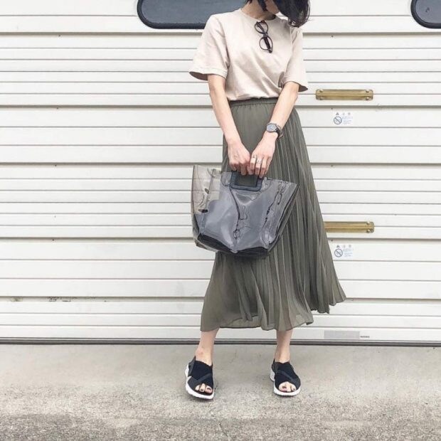 ユニクロの定番アイテム、プリーツスカート。トップスはTシャツ、カラーはアースカラーでまとめることで甘さ控えめなコーデが完成するんです。シンプルにまとめて小物で冒険しちゃいましょ。