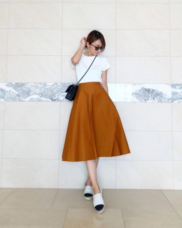 シルエットが美しいコットンサーキュラースカートは、シンプルに白Tを合わせるだけでキマります! ひざ下丈で、カジュアルになりすぎないコーデになりますよ。