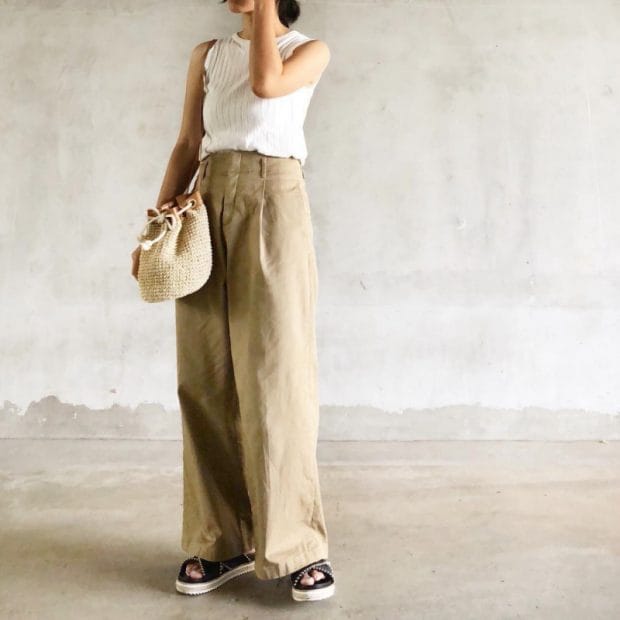スタイルアップ効果抜群のハイウエストチノワイドパンツ。トップスは軽めにリブの効いたノースリーブTをチョイス。全体のバランスを意識することで、スッキリとした印象になりますね。