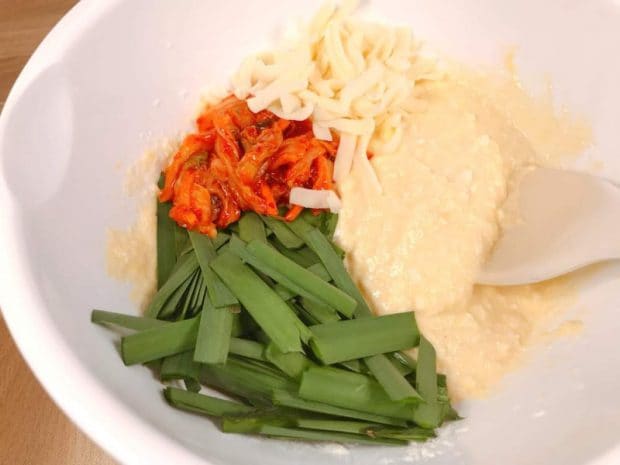 2) 生地がなめらかになったら、3cmほどに切ったニラ(1/2束)とキムチ、ピザ用チーズをそれぞれ適量加えます。だいたい30〜50g程度。