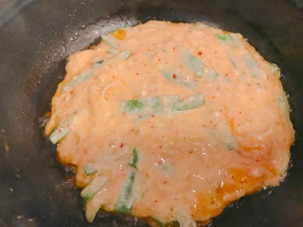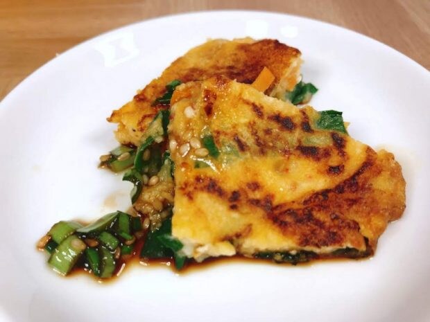 豆腐を使っているためでしょうか、ふっくらとお好み焼きのようなチヂミになりました! 外はカリカリ、中はふんわり。お好みの調味料でどうぞ。