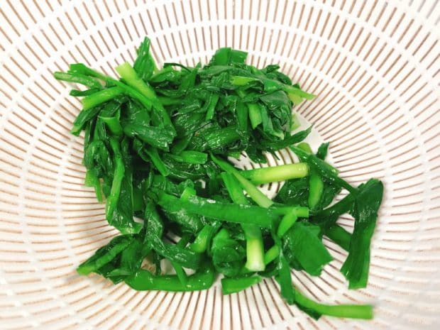3)まんべんなく熱湯をかけてから、冷水で冷やし、水気を絞ります。