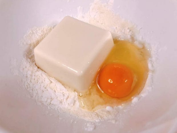 1) ボウルに豆腐、卵、小麦粉(大さじ3)、片栗粉(大さじ1)を入れよく混ぜます。豆腐は3パック売りのものを1個使いました(80g)。