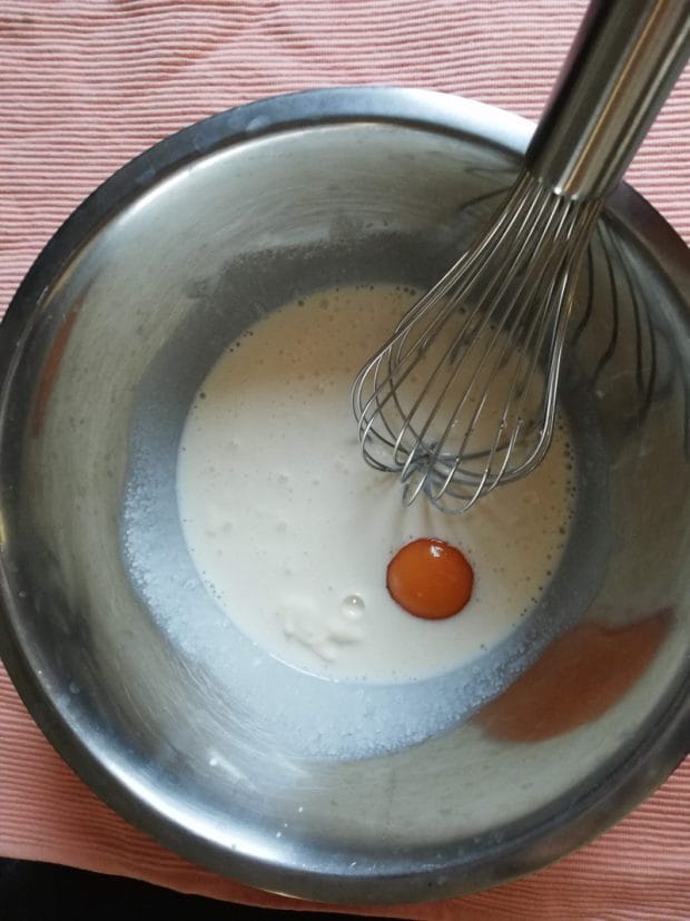 溶けたバニラアイスに卵を割り入れ、よく混ぜます。このとき、大きなボウルを使用したほうが混ぜやすいです。