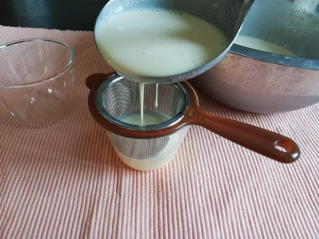 濾し器を通して、プリン型に流し入れます。筆者は100均で買った茶濾しが家にあったので、それを使いました。この「濾す」という作業が、なめらかなプリンにするためには必要な作業なんです。