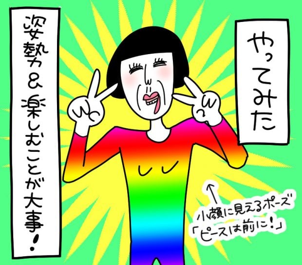 その日から、アドバイスをもとに鏡の前で練習を続けています。アンニュイな表情を作るのはなかなかハードルが高かったので、実践しやすいピースのポーズにチャレンジ! 小顔に見える「ピースを前に突き出し顔周りに持ってくる」ポーズです。