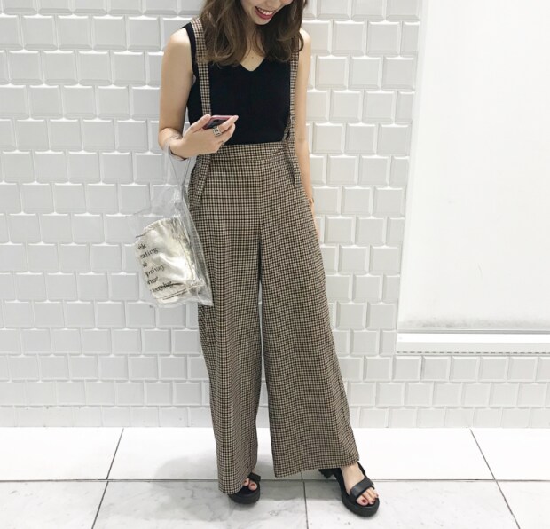 パンツ派や、普段カジュアルな着こなしが多い方におすすめのアイテムが「サス付ワイドパンツ(ガンクラブチェック)WT」。細身のサスペンダーに加え、腰回りがタイトなデザインなので、スッキリと洗練された印象の着こなしを叶えてくれます。お値段は2,490円(税別)。ダークカラーのVネック&ノースリーブのトップスを合わせると抜け感が出て、女性らしいコーデを演出できます。