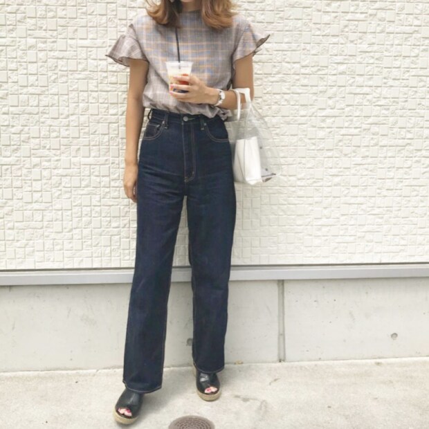 落ち着いたグレンチェック柄と甘めのフリルスリーブの塩梅が程よいブラウスは、デニムからスカートまで、着回しの幅が広いアイテム。お値段は1,490円(税別)です。ノンウォッシュのインディゴやブラックデニムを合わせると、こなれ感のあるカジュアルコーデに仕上がります。