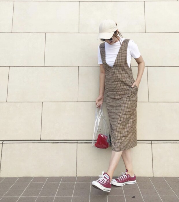 夏コーデのマンネリ打破と秋先取り、両方を叶えてくれるアイテムが、「ガンクラブチェック ジャンパードレス ノースリーブWT」。お値段は1,990円(税別)です。深Vネックに加え、程よくタイトなデザインで、大人っぽく着こなせるジャンパースカート。この夏着慣れたトップスに合わせれば、一瞬で新鮮な着こなしを演出できます。