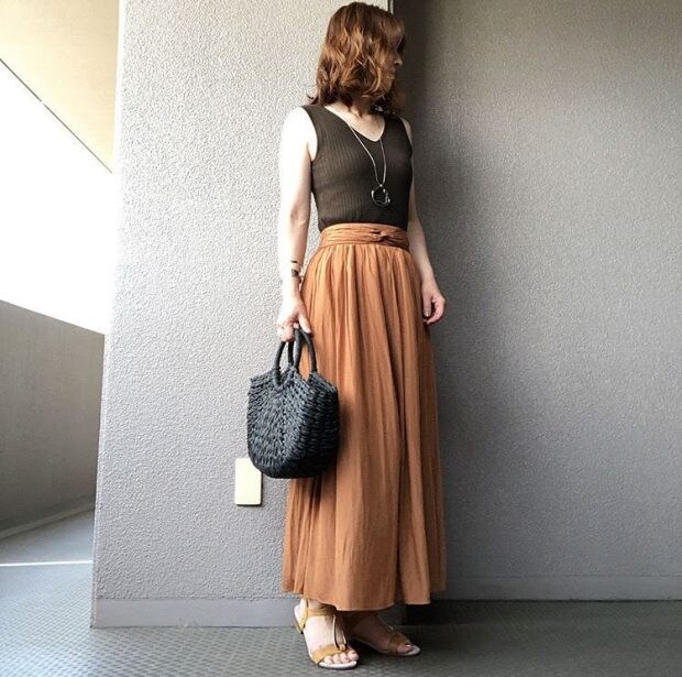 色数を抑えることで落ち着いた印象に。ふんわりと広がるユニクロのコットンサーキュラースカートが、女性らしさを高めてくれますね。