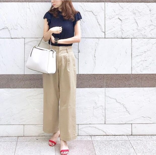 首元のさりげないフリルでフェミニンな印象に。シンプルな色と形なので、柄物のボトムスとの相性も◎。まだまだ暑い8月はサンダル、秋に向かっていく9月はパンプスやスニーカーなど、シューズを変えるだけでスタイリングの印象がぐっと変わります。夏だけでなく秋まで長く着られそうですね!
