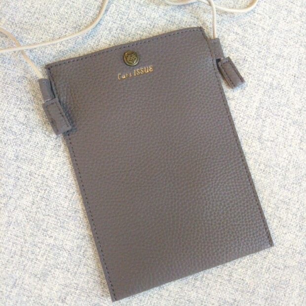 マチのないスリムな形のミニショルダーバッグは、(約)タテ19×ヨコ13.5cmで、ミニ財布とスマートフォンが入るサイズ感。スナップボタンには、猫の刻印が入っています。