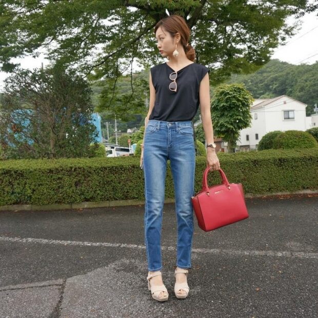 厚めのソールで存在感のあるサンダルはデニムの定番スタイルの印象をガラリと変えてくれます。指し色で投入された赤いバッグで女性らしさがさらにアップ。