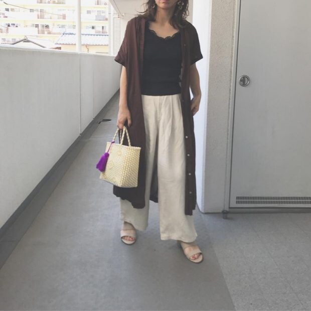 ロングワンピースをさっと羽織れば、涼し気でありながらも落ち着いた着こなしに。秋カラーでシックにまとまります。