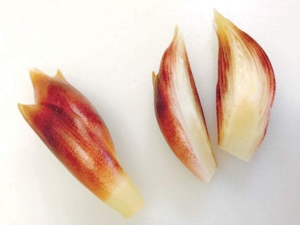 みょうがを千切りにする時は、まず根元を切り落としてから、縦半分に切ります。