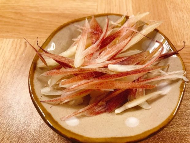 切り口をまな板につけて、できるだけ細く切ったら千切りのできあがり。さっと水にさらすことでアク抜きができます。ただし、さらしすぎると香りや辛味が抜けてしまうので、10秒程度がベストです。
