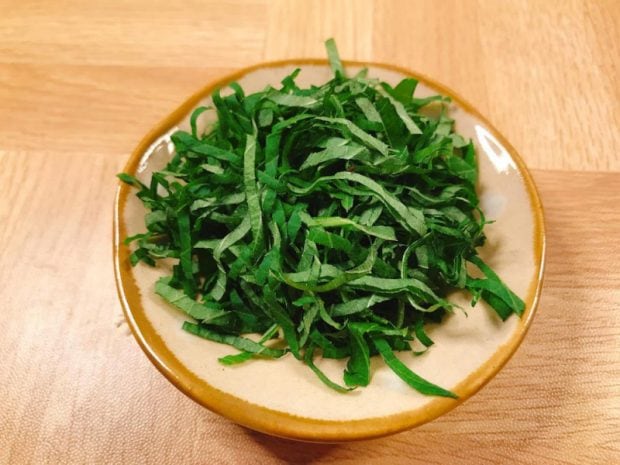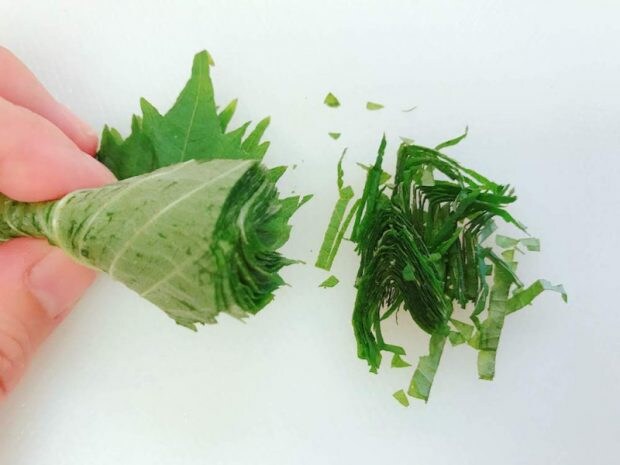 大葉の千切りの出来上がり。薬味だけではなく、パスタの具材にもよく使われていますよね。