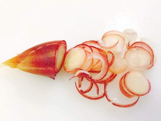 小口切りは、根元を切り落としたみょうがをそのまま端から輪切りにしていくだけ。水にさらした後、さっと箸でみょうがをほぐしてあげると、その後具材と絡みやすくなりますよ。