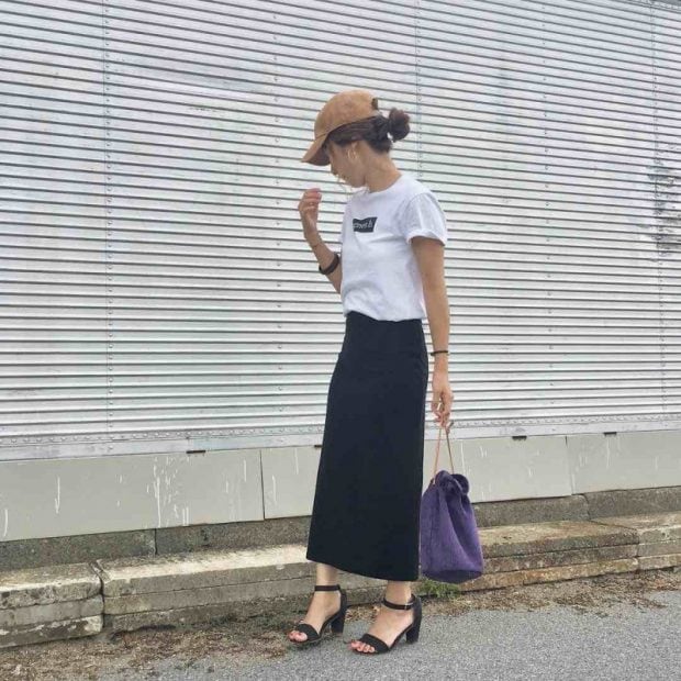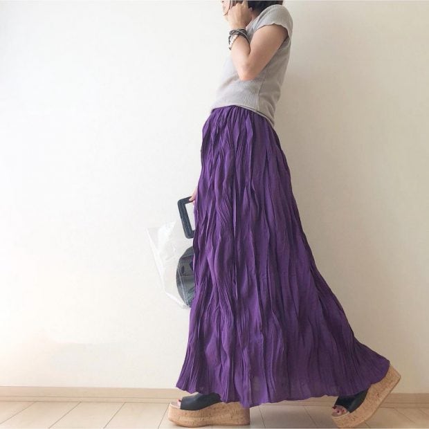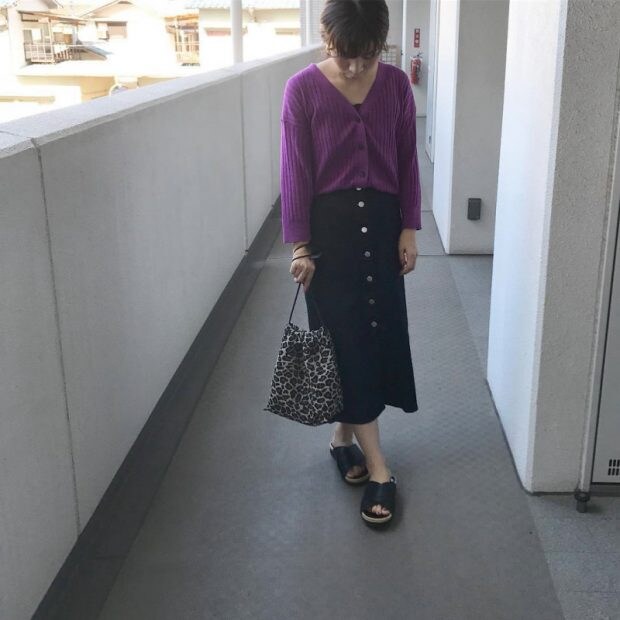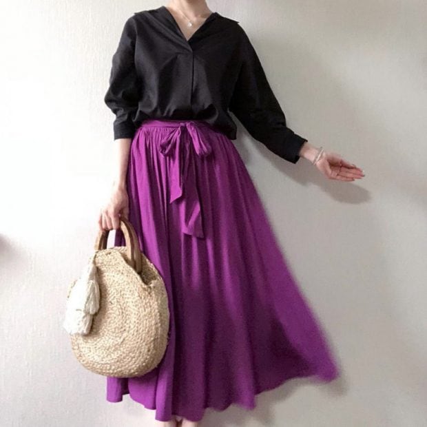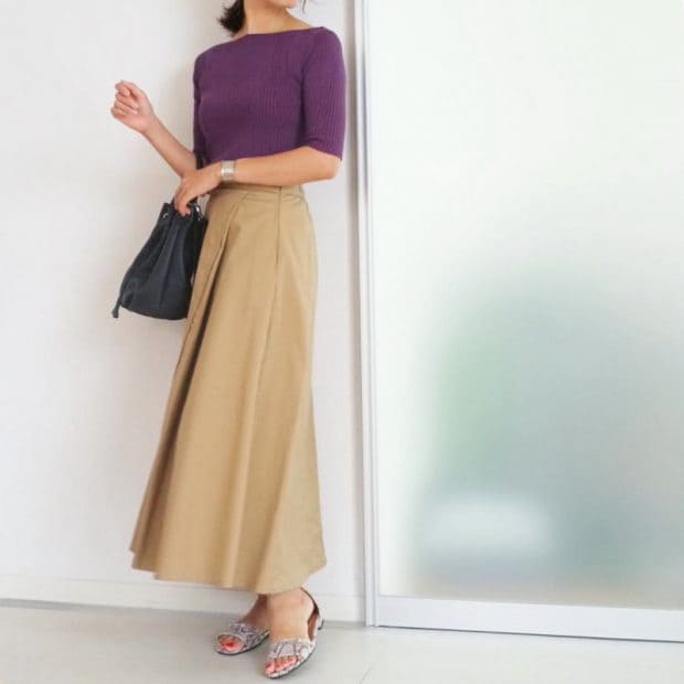 履くだけでドラマチックなコーディネートが叶うカラースカートもパープルをチョイス! トップスはブラックでまとめることで、甘さを抑えてくれレディな着こなし!