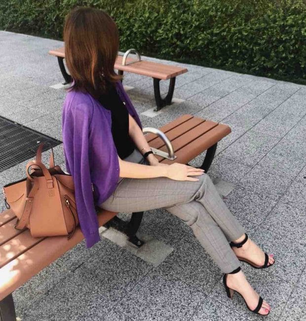 チェック柄のパンツをレディに着こなすなら、パープルのチョイスがベスト。さらっと羽織るだけで女っぷりをアピールできちゃいます。今秋もチェックはトレンドアイテム。組み合わせることでより今年らしいスタイリングになりますよ。