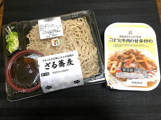 (1) ごぼうと牛肉の甘辛炒めとめんつゆを温めて合わせて、お湯で少し割り付属ネギをのせる。