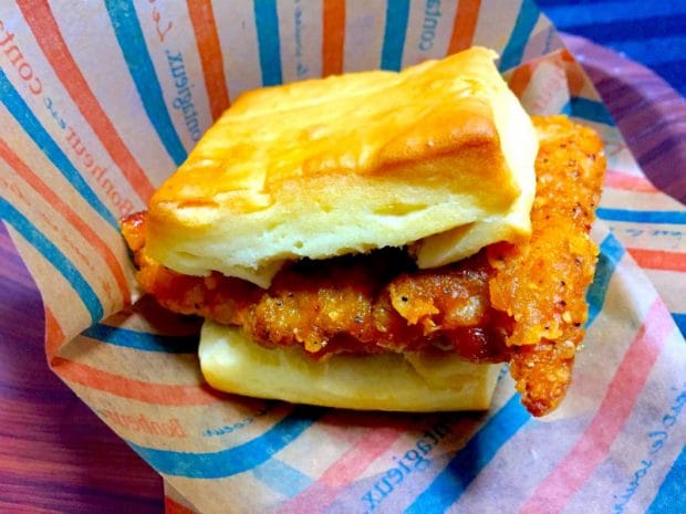 解凍したホットビスケットを半分に開いてチキンをのせ、付属のハチミツをかけサンドする