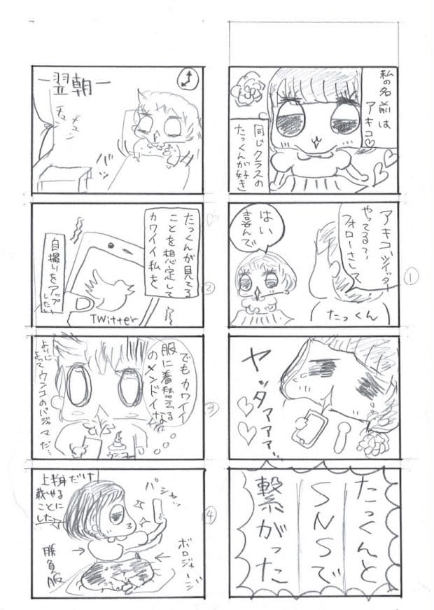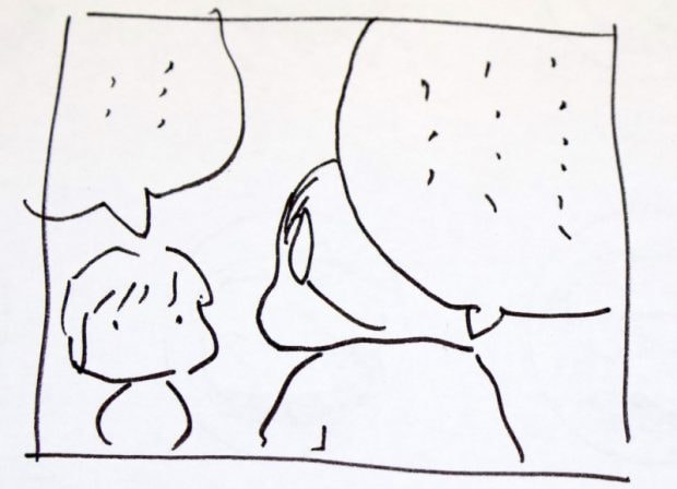 そんなストーリーを完成させて先生に見ていただくと「このエピソードなら、ここから4コマくらい削れるね」と添削してくれました。一瞬でストーリーを編集し、叙情的な部分はカット。セリフを少し整えてから4コマ漫画にしていきます。