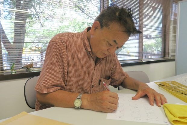 円形定規を使い、真っ白な紙にたくさんの円を書き始めた吉本先生。