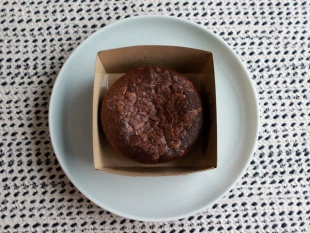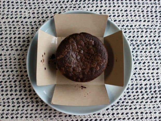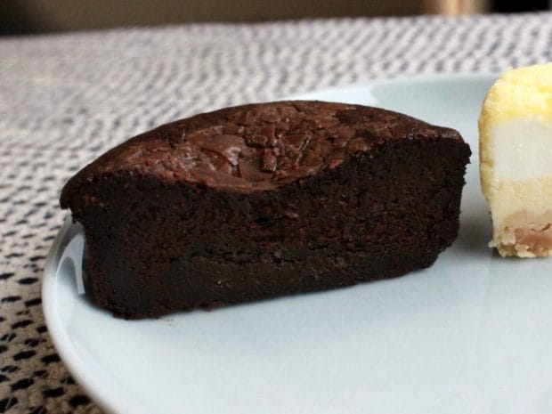もうひとつのチルドスイーツが「ガトーショコラ」。チーズケーキと同じくサイズは直径が約9cm(3号サイズ)です。中心には生チョコレートが入っています。