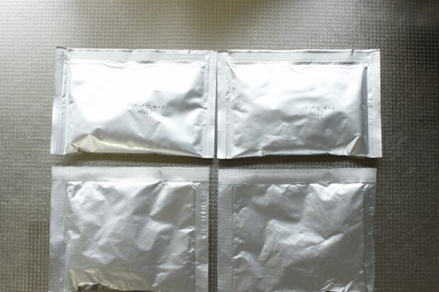 袋を開けてみると中には小袋が4つ。表面にペペロンチーノと書かれているものには液状のパスタソース、何も書かれていない袋には粉末ペペロンチーノが、それぞれ2袋ずつ入っています。
