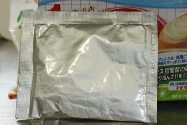 ガーリックトーストには、文字が書かれていない袋を使います。見ただけだとわかりづらいので、手で軽く振って中身が粉末なのを確認してみました。