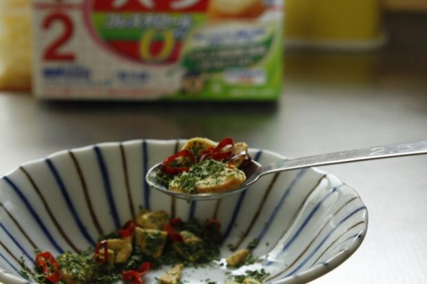 ③小さじでペペロンチーノの粉末を振り落とし、トースターに食パンを入れます。