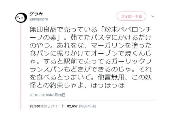 最近、Twitterで無印良品の「あえるだけのパスタソース ペペロンチーノ」を使ったガーリックトーストが話題になっています。