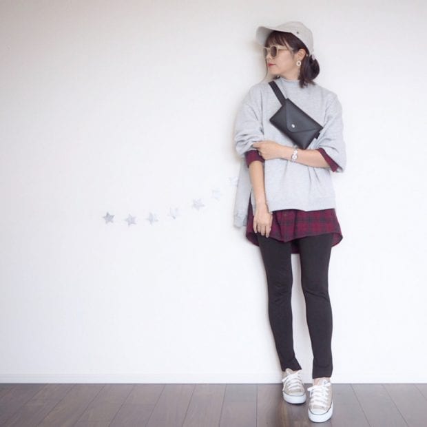 オーバーサイズのスエットと長めのシャツをワンピ風にしたコーデ合わせもキマりますよ。チェックシャツをチラ見えさせて遊ぶのもレイヤードスタイルが楽しめる季節ならでは。
