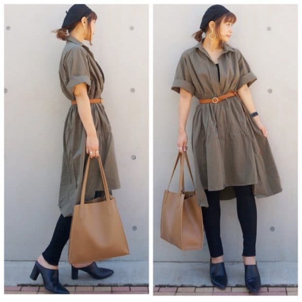 ガーリーなワンピースもレギパンでカジュアルダウン。短めの丈のワンピースも印象を変えて着ることができますよ。足元は同カラーで揃えることで、統一感を出してスタイルアップ!!
