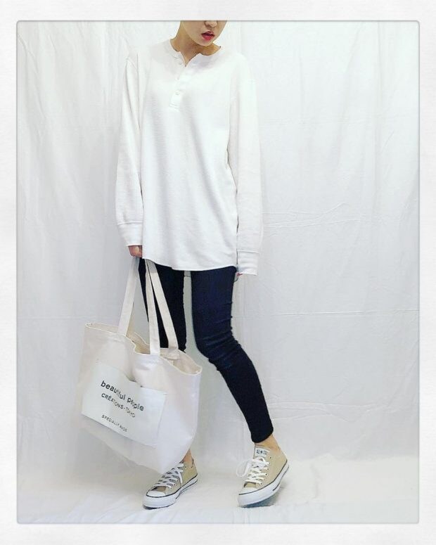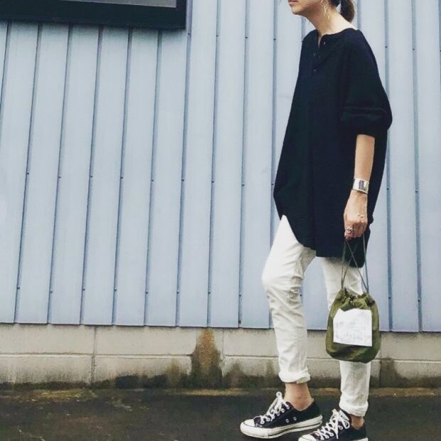 モノトーン配色では印象が変化! 袖をまくって手首を出せば、メンズTシャツにパンツ、スニーカーとカジュアルなアイテムばかりなのに女性らしさを感じるコーデに。