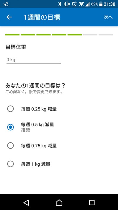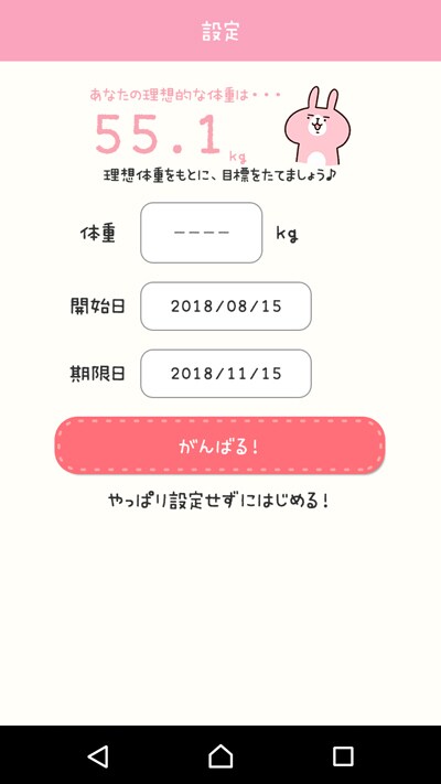 そのあと、目標体重を設定します。理想の体重が表示されているので、目安にしてみてください。