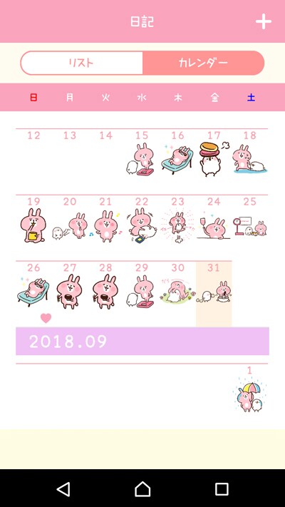 日記一覧も、こんなにかわいい! スタンプ設定をすれば、日記を書かなくても表示されます。日記を書く時間がない時は、その日の気分をスタンプで残すだけでも記録になりますよ。