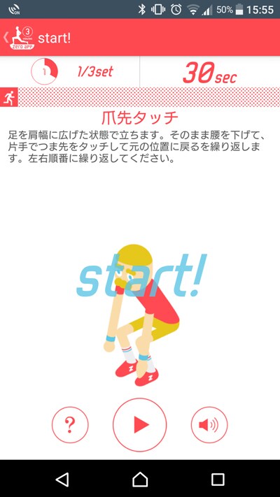 エクササイズのスタートです。キャラクターが画面で一緒に動いてエクササイズをしてくれますよ。30秒×6種目を行うのですが、1種目終わると20秒の休憩時間を挟みます。残り時間を声で知らせてくれるので、画面を見ていなくても大丈夫。
