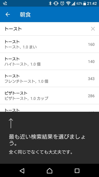 食事を記録する際、メニューを入力すると候補がたくさん出てきます。全く同じでなくても大丈夫なので、近いものを選びましょう。分量も調節できますよ。