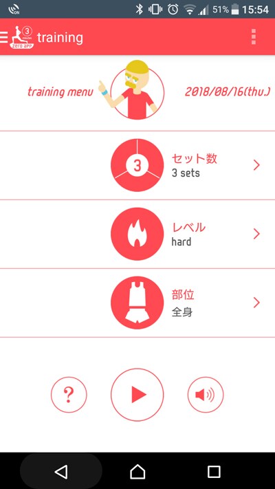 セット数とレベルとトレーニングしたい部位を選択します。運動が苦手な方は、レベルは「easy」、セット数は「1set」をから始めることのがオススメ。