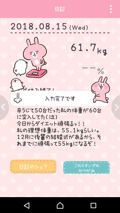 日記には食事内容、運動の記録などをつけると◎。生理やお通じなどのペースも把握しておきましょう。全部で100種類あるスタンプを使ってかわいい日記に仕上げることができます。体重記入も日記も後から編集することもできるので、うっかり記録するのを忘れても心配いりません。