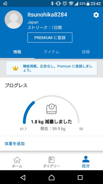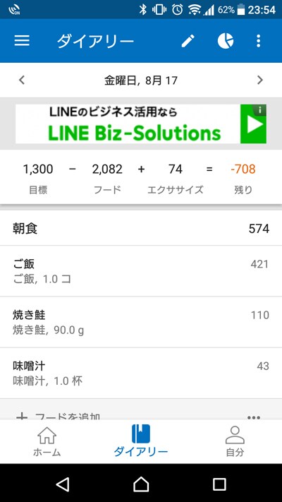 こちらがホーム画面です。「ダイアリー」は、食事とエクササイズの記録、「自分」は、体重の記録を入力できます。
