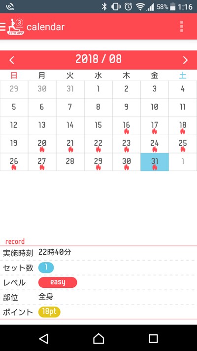 予想以上にヘトヘトになるので、画面を見なくても休憩時間を教えてくれるのはありがたかったです。1人だとやらないことでも、声をかけてくれる人(アプリ)がいるだけで、続けることができました。部位やセット数、レベルなど細かく設定できたので、無理なくトレーニングを楽しめます。しかし、途中でやめてしまうと記録に残らないことと、1日に何回やっても1回分の記録にしかないところに不便を感じました。