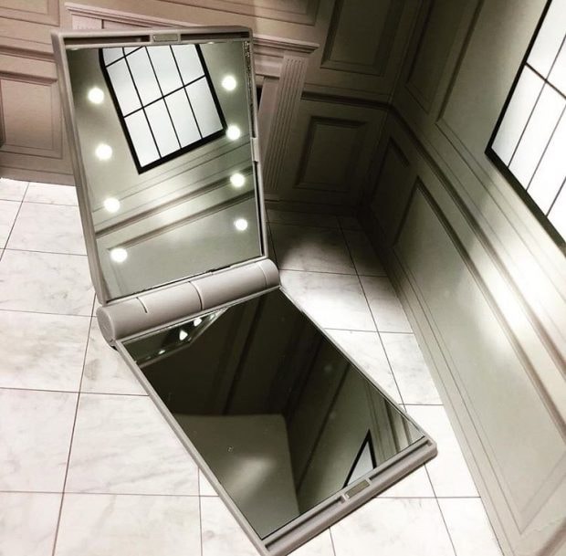 2種類のミラーで、片面はLEDライト付きで暗い場所でのメイクにも対応。片面は拡大鏡なので、メイクの細かいところまでチェックできるんです。