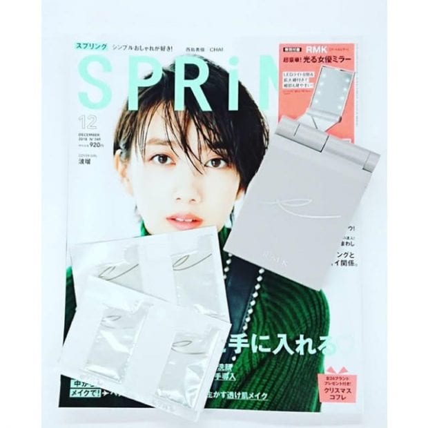 雑誌「SPRiNG」12月号もLEDライト付きのミラーが付録になっています。RMKとコラボした女優ミラーは、シックなライトグレーにRMKのロゴが入っています。