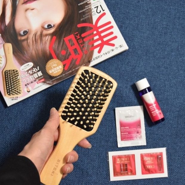 雑誌「美的」のオリジナルの付録は、美容研究家の樋口賢介さんが監修した天然木製のパドルブラシ。ブラシの毛先は天然竹で、頭皮や頭筋を気持ちよくマッサージできます。