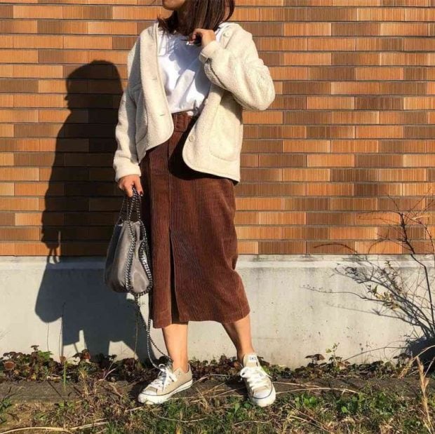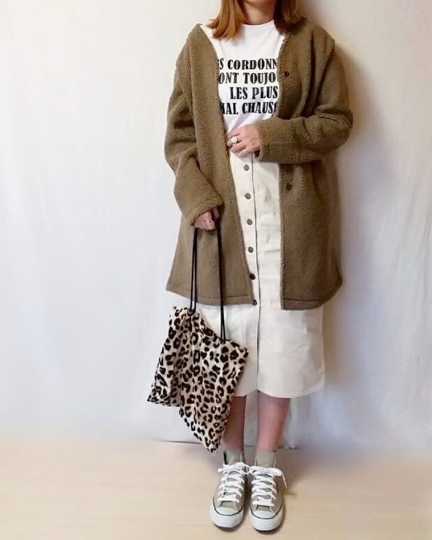 ショート丈なので、ハイウエストボトムスと合わせれば、スタイルアップ効果も抜群です。コーデュロイのスカートを合わせれば、秋らしいコーディネートが完成します。