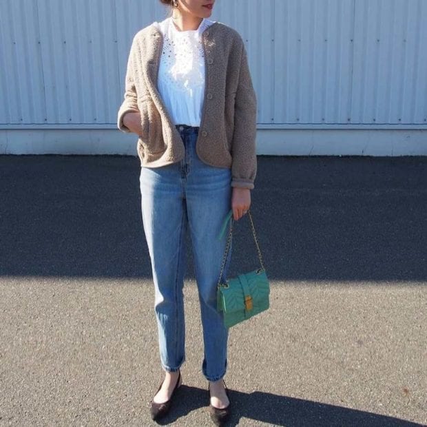 デニム×フリースの組み合わせは、なんとなく野暮ったくなりがち。トップスはブラウス、足元はパンプスにすることでスタイリッシュに着こなせます。ミニサイズのバッグを合わせると、さらにおしゃれ度が増しますね♪