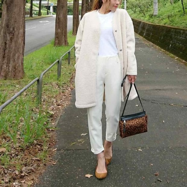 ブラウンのコートは、トップスとボトムスをホワイトでまとめると、軽やかな印象のコーデに仕上がります。